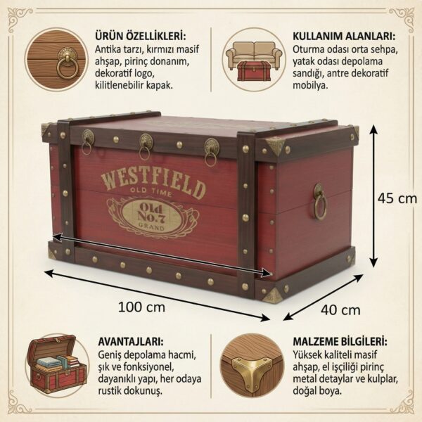 Vintage Görünümlü Masif Ahşap Sandık & Orta Sehpa - Dekoratif Kilitli Retro Depolama Kutusu