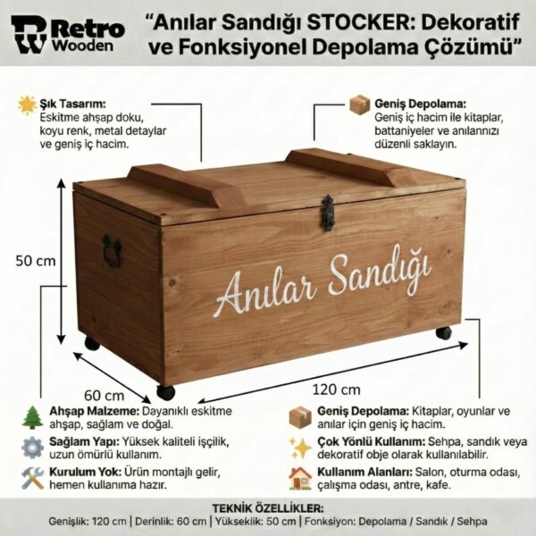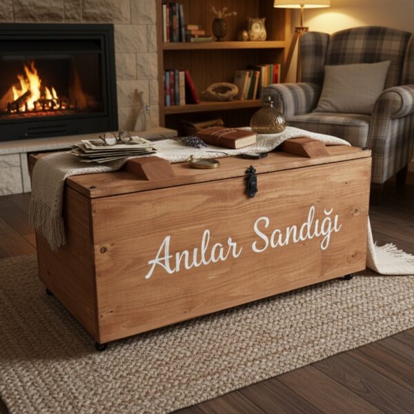 Dekoratif Tekerlekli Doğal Ahşap Sandık – Eskitme Görünümlü Çok Amaçlı Saklama Kutusu ve Orta Sehpa