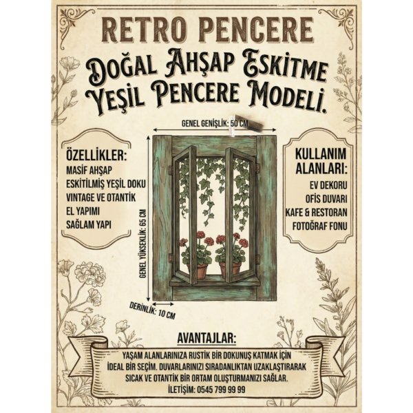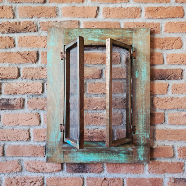 Doğal Ahşap Eskitme Yeşil Dekoratif Pencere – Rustik ve Vintage Duvar Süsü