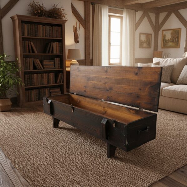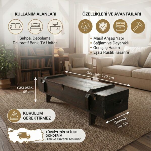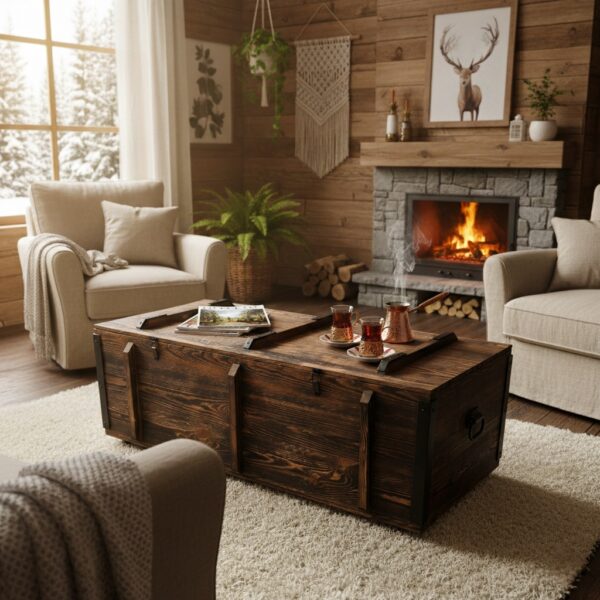 Doğal Masif Ahşap Sandık Orta Sehpa - Tekerlekli & Geniş Saklama Alanlı Rustik Tasarım