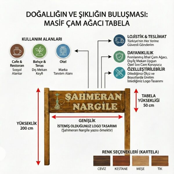 • Ahşap Tabelalar: Doğal ve rustik bir görünüm arayan kafeler, butik oteller ve restoranlar için sıcak bir atmosfer yaratır.