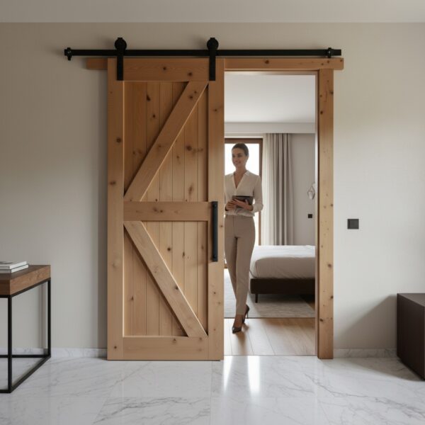 * ✨ Estetik Vurgu: Kapı üzerindeki çapraz ahşap detaylar (Z model), ürüne klasik bir “Barn Door” havası katarak mekanın atmosferini zenginleştirir.