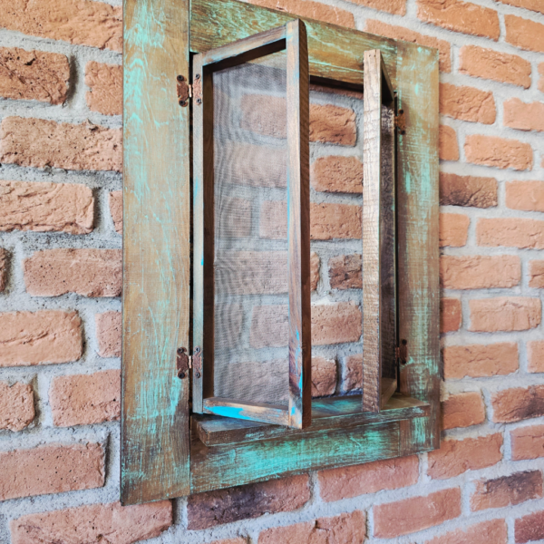 Doğal Ahşap Eskitme Yeşil Dekoratif Pencere – Rustik ve Vintage Duvar Süsü