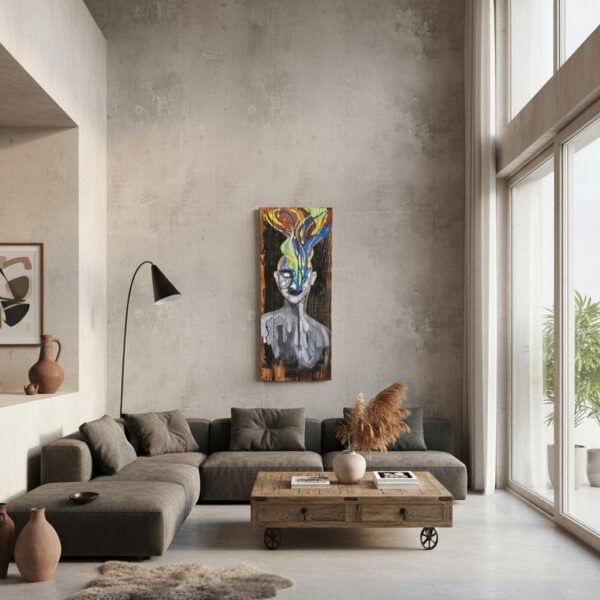 Bu eser, siyah-beyaz bir portreden fışkıran rengarenk düşünceleri ve yaratıcılığı simgeler. “Zihnin Özgürleşmesi” olarak yorumlanabilecek bu soyut çalışma, izleyen herkeste farklı bir duygu uyandırarak mekanınıza entelektüel ve sanatsal bir derinlik kazandırır.