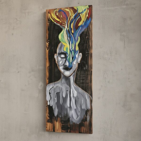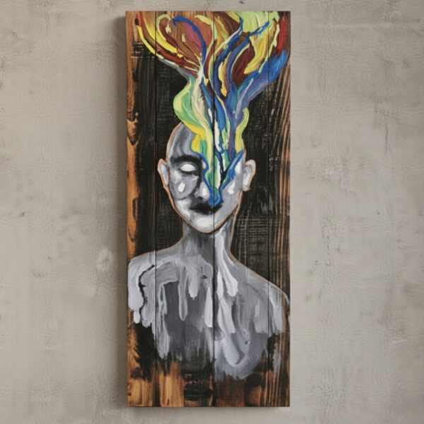 El Yapımı Masif Ahşap Soyut Yüz Tablosu – Renkli Zihin Temalı Modern Duvar Dekoru