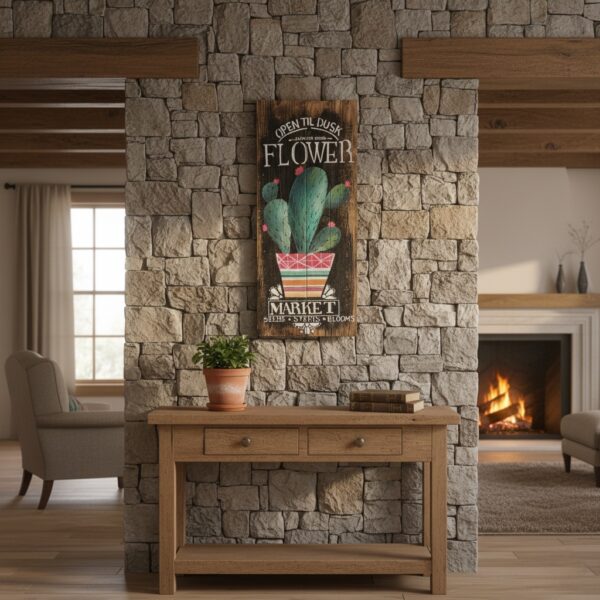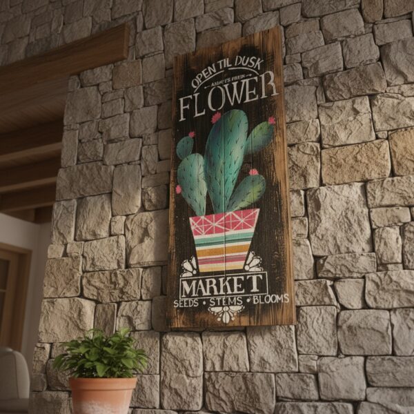 Flower Market_ Temalı Kaktüs Figürlü El Yapımı Masif Ahşap Duvar Panosu – Rustik Botanik Balkon ve Mutfak Dekoru