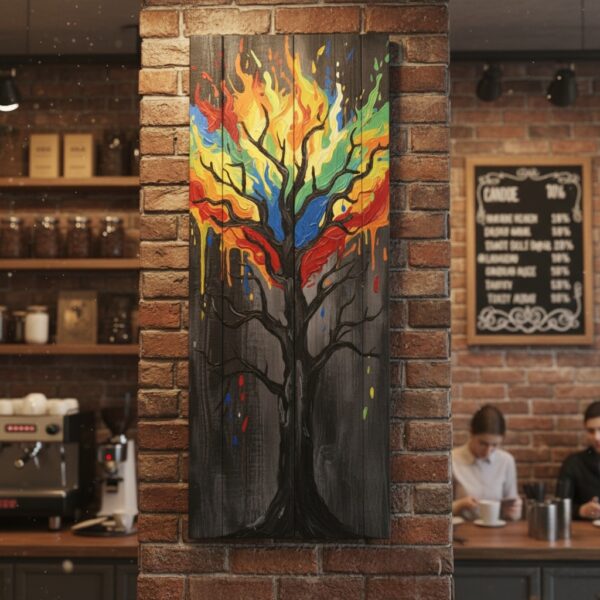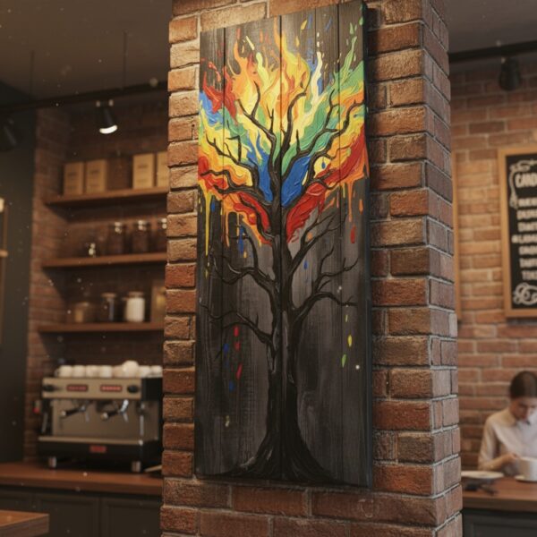 Bu tasarımda, kökleri derinlere inen ve dalları gökyüzüne uzanan “Hayat Ağacı” figürü, modern bir yorumla ele alınmıştır. Dallarından süzülen renk damlaları, mekana dinamizm ve pozitif enerji katar. Sıradan bir dijital baskı değil, ahşabın ruhuna dokunan gerçek bir el işçiliğidir.