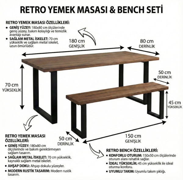 Evinizde veya işletmenizde sıcak, samimi ve estetik bir yemek alanı yaratmak isteyenler için Retro Yemek Masası ve Bench Setimiz ideal bir seçimdir. Hem modern hem de nostaljik bir hava katan bu takım, dayanıklılığı ve şıklığı bir arada sunuyor.