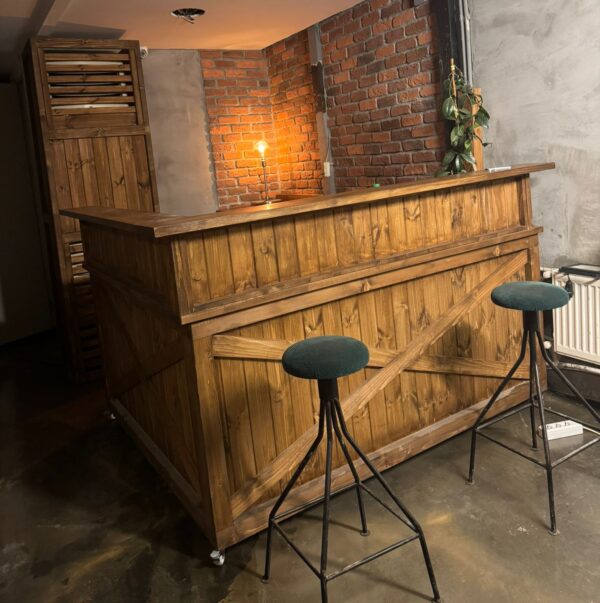 Retrowooden Özel Tasarım Ahşap L-Bar Tezgahı- Fırınlanmış Çam, Logolu ve Aydınlatmalı