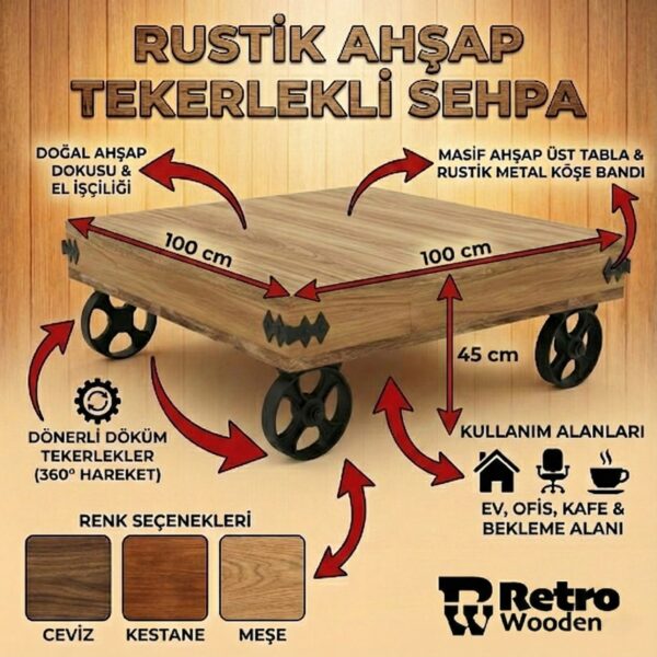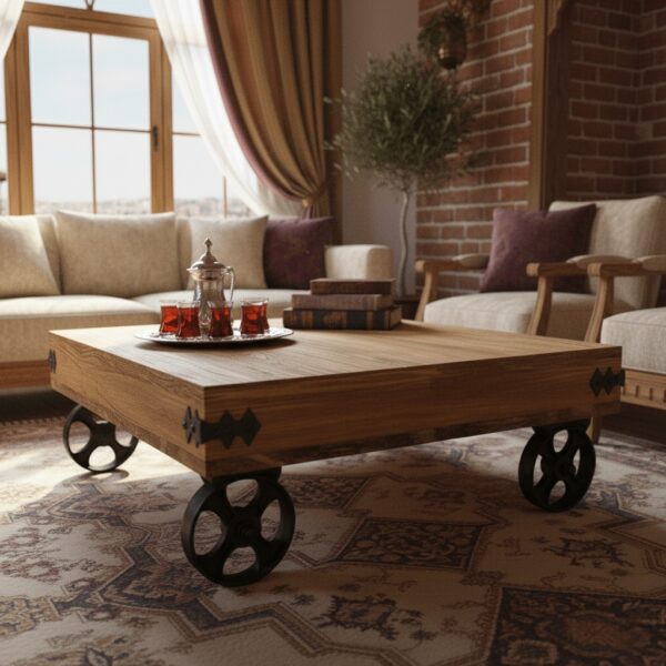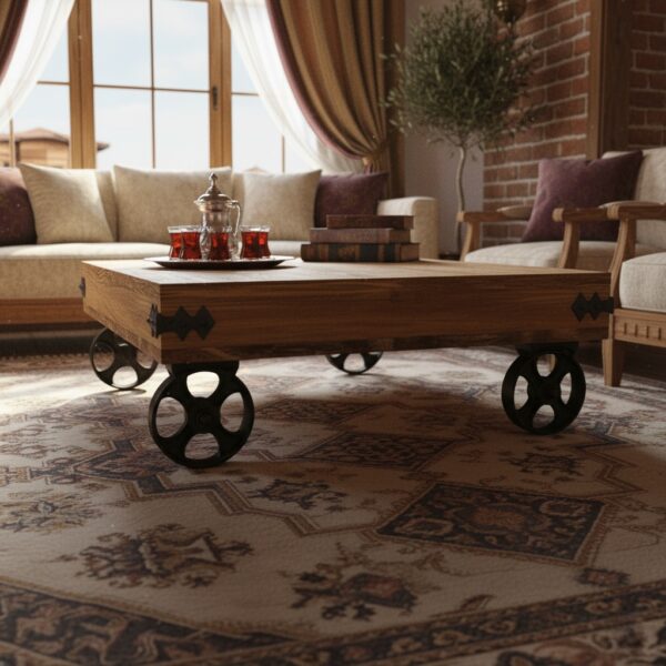 * Dayanıklı Yapı: Yüksek kaliteli ahşap ve sağlam döküm tekerlekler kullanılarak üretilen sehpa, uzun yıllar boyunca ilk günkü estetiğini ve dayanıklılığını korur.
