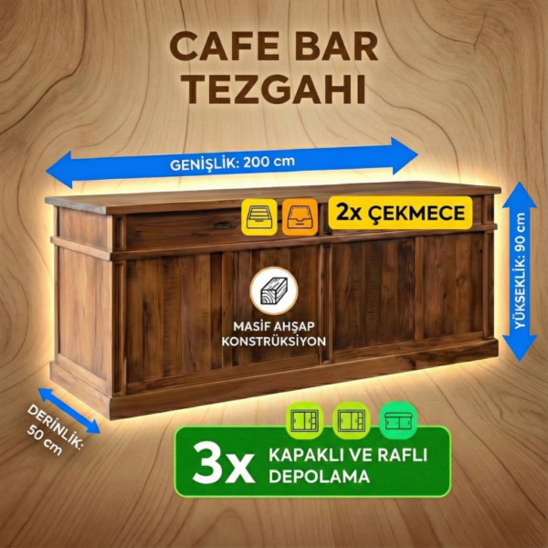 İşletmenize prestij katacak %100 masif ahşap bar tezgahı ve servis bankosu. 2 çekmece ve 3 kapaklı geniş depolama alanıyla hem şık hem fonksiyonel. Cafe, restoran ve ofisler için ideal doğal tasarım. Hemen inceleyin!