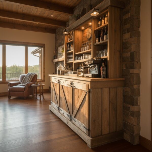 Rustik Masif Ahşap Kahve Köşesi ve Bar İstasyonu – Aydınlatmalı Farmhouse Mutfak Büfesi